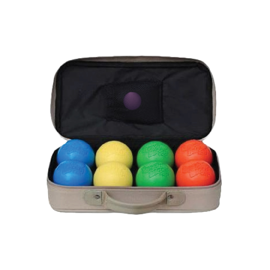 Bocce set includes 8 Balls in bright beach-ball colors, made of tough synthetic polymers and injection-molded.